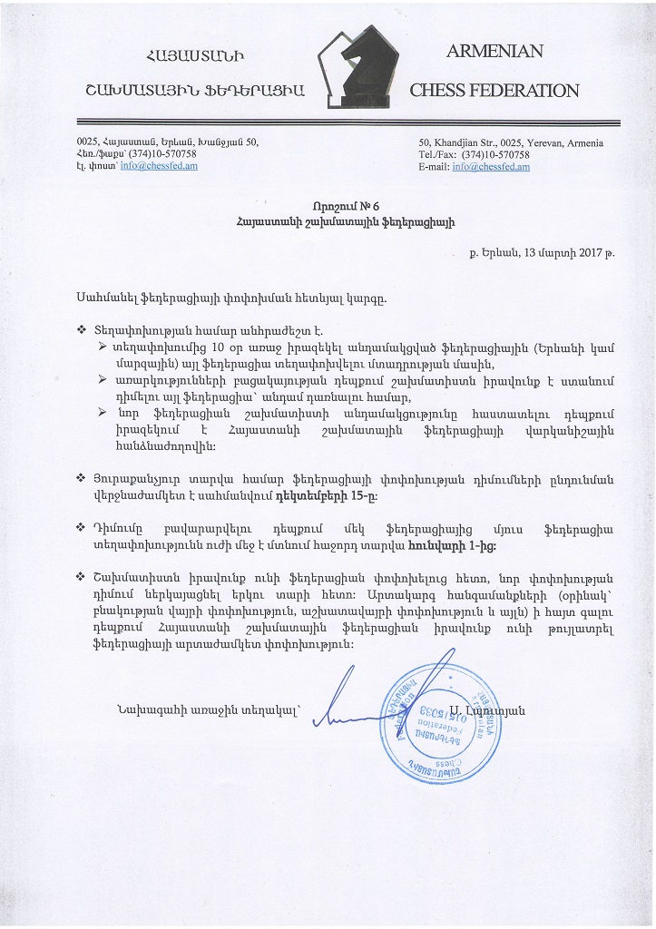 Հայաստանի շախմատի Ֆեդերացիայի որոշում N6